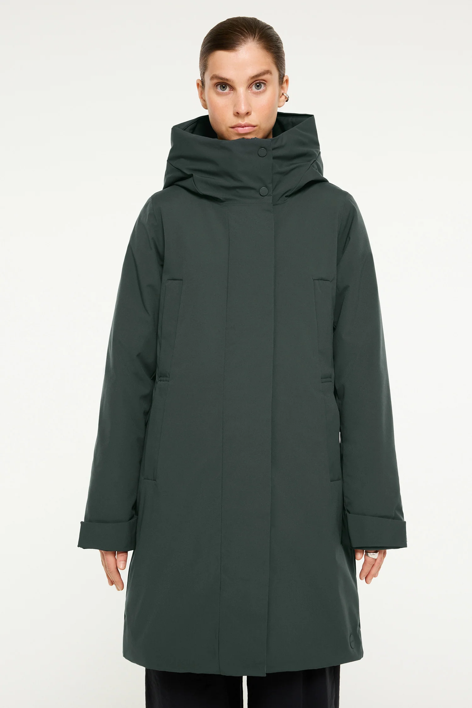 Eline is a hooded winter jacket with a fitted silhouette made in a Pet Poly 5K fabric. The material is quick-drying and has a waterproof membrane that protects from sudden downpour. The 4-way stretch adds comfort while a brilliant colour fastness maintains the jacket’s fresh look from one season to another. Details include double welt pockets and vital taped seams. Eline brings a sophisticated, active look in cold city winters. The model is 173 cm tall and wearing a size S. Length of winter jacket: 96 cm (size S). Ref. 331192434