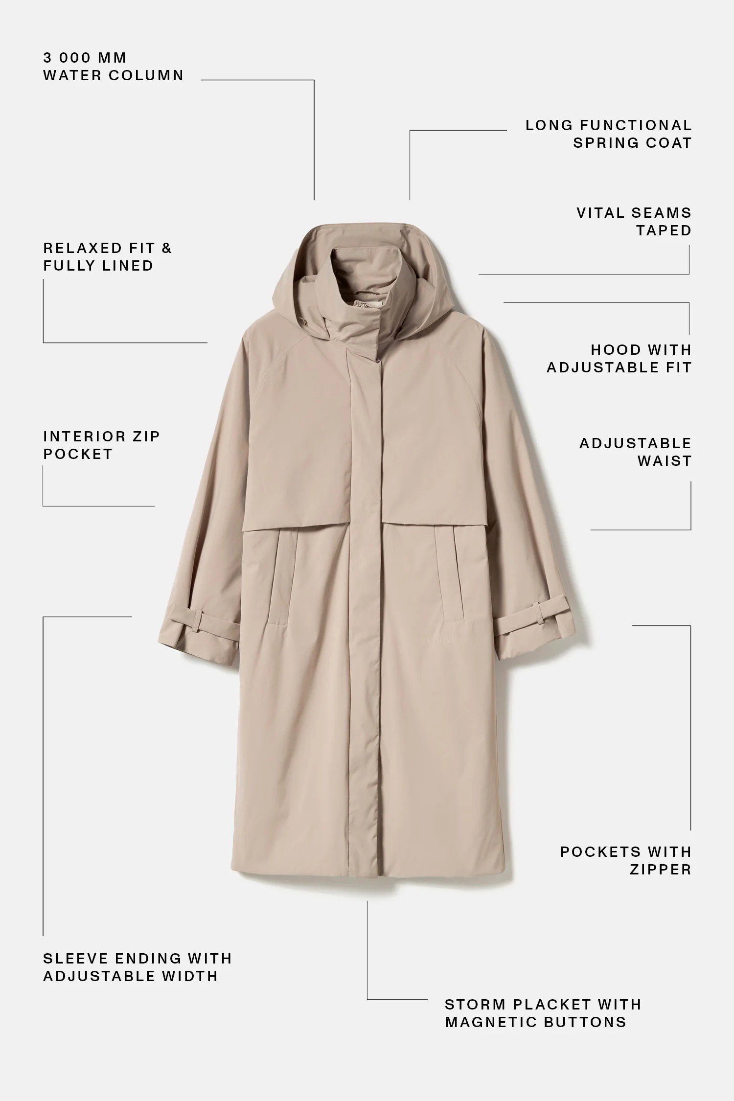 Kelly is a long coat with a generous fit and clean lines. Made from Matte Motion 3K – a soft, water-resistant fabric with subtle stretch. A timeless piece balancing urban elegance and practical comfort.