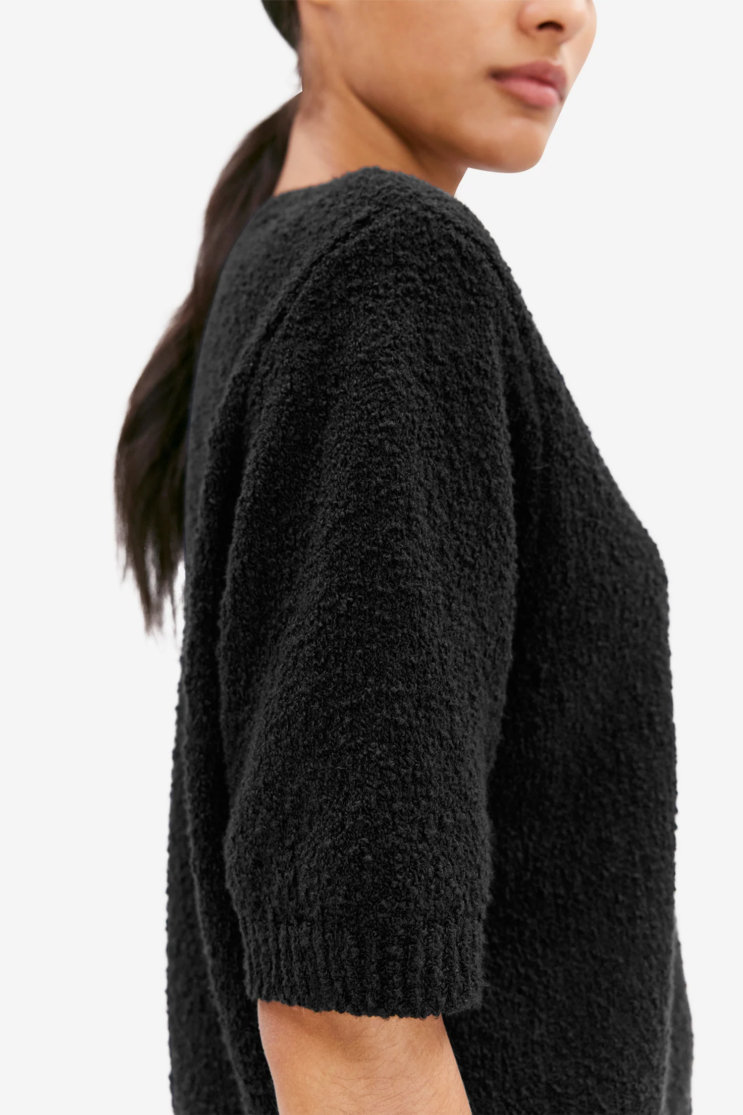 Tara is a short-sleeved knitted tee made from a Soft Cotton Mix fabric. The sleeves end above the elbow, making this piece a stylish alternative to a classic tee. Details include a crew neck, short body, and ELVINE embroidery. Wear Tara to elevate your everyday look. The model is 177 cm tall and wearing a size S. Length of the garment: 54 cm (size S). Ref. 331211110