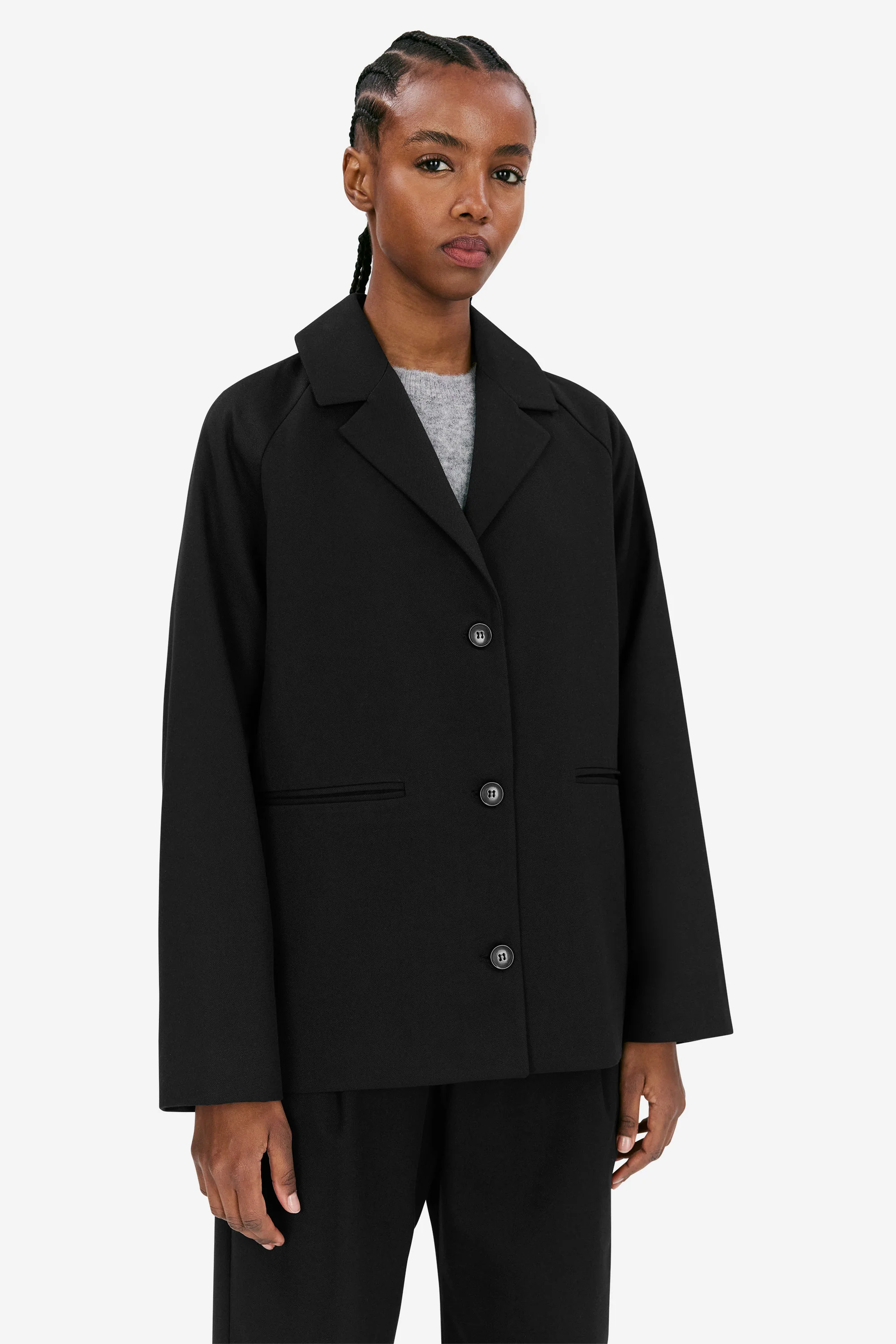 Zeca is the love child of jackets and blazers. A straight cut and relaxed fit are further heightened with dobby structure fabric, a slit in the back, and raglan sleeves. Zeca easily transitions its wearer from the day’s inside events to the night’s tantalising adventures. Pair with Helmi or Sandi for a fresh city look. The model is 174 cm tall and wearing a size S. Length of jacket: 68,5 cm (size S). Ref. 330571110